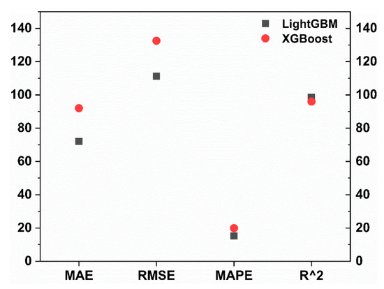 where signifies the measured (actual) green construction cost, epitomizes the predicted result, represents the mean of the , signifies the number of the datasets utilized, and is the independent attribute. The prediction accuracy improves if approaches one as well as , , and measures approach zero. The findings of the evaluation metrics were calculated, as shown in Figure 10.