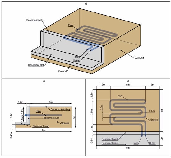 Figure 1 illustrates the geometric model used for the numerical simulation. The HGHE is placed on purpose adjacent to the building basement wall, with the objective to use the residual heat lost from the basement. The overall area of the HGHE, where the pipe is buried, is approximately 25 m2. The considered dimensions for simulation of the HGHE are 9 m length, 6 m width, 3 m depth, and 2 m width stretching inside the basement. The pipe is a Ø20 mm polyethylene pipe buried 1.2 m deep, in a simple U configuration, with a 50 cm step. The distance of the pipe from the basement wall is 1 m.