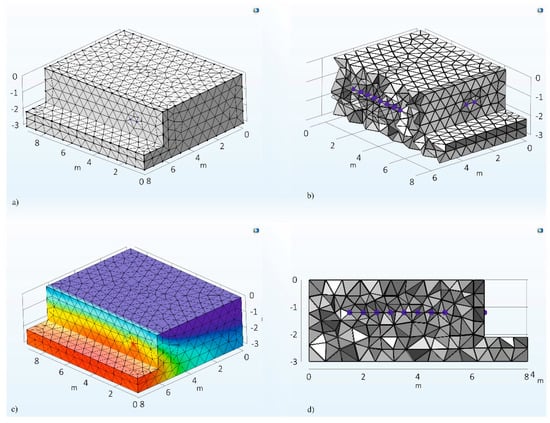 The tri-dimensional computational grid for the HGHE used for numerical simulation: (a) 3D computational grid exterior surfaces; (b) 3D section computational grid with interior and pipes visible; (c) 3D computational grid with temperature distribution; (d) 2D section perpendicular to the basement wall with pipes visible.