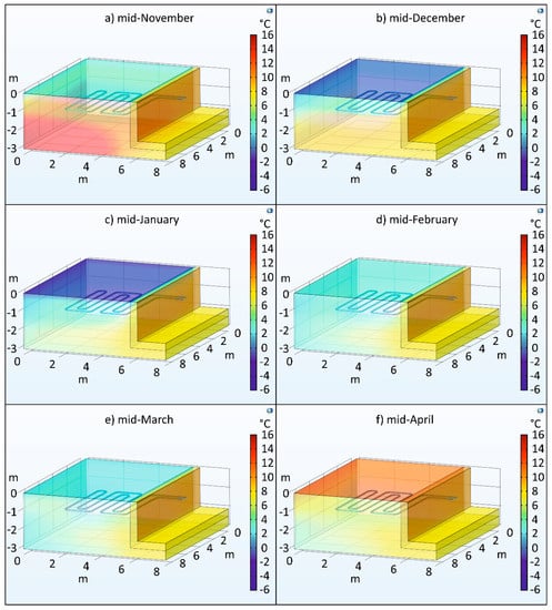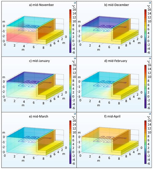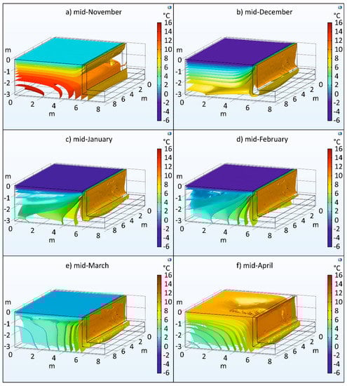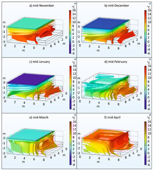 The tri-dimensional temperature gradients for the simulation case 1—HGHE with no auxiliary heat sources: (a) mid-November; (b) mid-December; (c) mid-January; (d) mid-February; (e) mid-March; (f) mid-April.