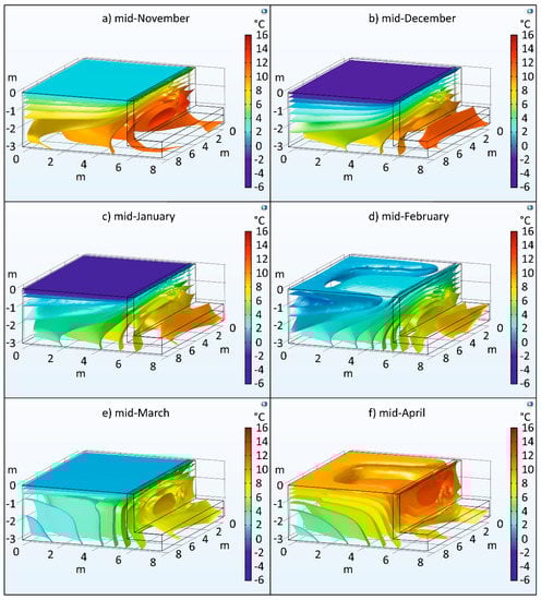 The tri-dimensional temperature isosurfaces for the simulation case 2—HGHE with a heated basement: (a) mid-November; (b) mid-December; (c) mid-January; (d) mid-February; (e) mid-March; (f) mid-April.
