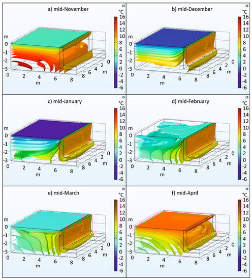 The tri-dimensional temperature gradients for the simulation case 3—HGHE with heat from solar thermal panels: (a) mid-November; (b) mid-December; (c) mid-January; (d) mid-February; (e) mid-March; (f) mid-April.