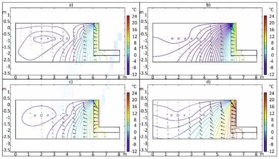 Bi-dimensional section through the HGHE, perpendicular to the basement wall for the day with the lowest temperature simulated, corresponding to the day of 27 January, as follows: (a) case 1–no auxiliary heat sources; (b) case 2–heated basement; (c) case 3–solar thermal panels; (d) case 4–both auxiliary heat sources. The arrows indicate the heat direction.