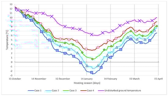 Thus, compared with simulation case 1, the ground freezing period decreased by approximately 24.74% by having a heated basement, approximately 40.20% by transferring heat with solar thermal panels, and approximately 62.88% by using both auxiliary heat sources. This is also observed in Figure 11, where the mean temperature at a pipe depth of 1.2 m is illustrated for all 4 simulation cases in relation to the undisturbed ground temperature measured at a 15 m distance near an unheated part of the basement.