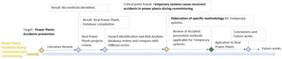 In this study, we carried out an investigation of the methods and techniques of hazard identification and risk analysis that are performed during the construction of power plants that use non-renewable sources. A detailed review of the literature is provided, and references are grouped and classified into similar blocks. Due to the difficulties in finding a specific methodology from the literature review, an extensive database of conventional power plants construction projects was used. Projects have been developed by international contractors and original equipment manufacturers in recent decades. Studies carried out in each phase of the project life cycle are reviewed in detail. Figure 1 shows a flowchart with the main steps followed in this research.