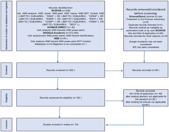 As part of this study, a systematic review of the scientific literature related to the main subject of the investigation was performed. The aim was to obtain all the relevant information, as well as to know the state of the art of risk assessment and hazard identification methods applied for power plant construction projects. Guidelines of the PRISMA declaration revised in 2020 [] were followed. Figure 2 shows the PRISMA flowchart of the process followed for this literature review.