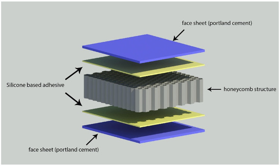 The mixture was then poured into molds of two different sizes and two different shapes of rectangular and square for testing: 160 mm × 40 mm × 4 mm for flexural and 300 mm × 300 mm × 4 mm for thermal tests, according to ASTM testing procedures for thermal and flexural samples [23]. Air bubbles should be removed to achieve uniformity in the material; thus, prodding along the edges of the mold, in combination with cyclic agitation, is used to remove air bubbles. The samples were then covered in plastic and cured at room temperature (22 ± 1 °C) for 24 h before being de-molded. De-molded samples were left at room temperature for 28 days. The kraft-paper honeycomb material was then cut into two sizes to match the footprint of the cementitious flexural and thermal samples. A caulking gun was used to apply the adhesive to the interior face before evenly distributing it with a spatula to achieve a uniform spread, 1 mm in thickness. Pressing the honeycomb material into the adhesive on both sides completes the honeycomb sandwich panel construction. The samples were cured with uniform pressure under a 1 kg weight for 72 h to ensure even bonding of the adhesive over the sample’s surface area. Table 2 summarizes the composition of five types of mixed designs used for testing.