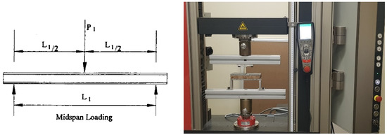 A ZwickRoell universal testing machine was used to determine the flexural strength of the panels according to ASTM C393 “Standard Test Method for Core Shear Properties of Sandwich Constructions by Beam Flexure” [23]. The flexure test is effective in determining the sandwich flexural stiffness and the core shear strength. Determining the mean flexural strength included testing five honeycomb sandwich panels of each category of under 3-point bending. Figure 3 shows the flexural-strength-testing setup of the honeycomb sandwich panels.