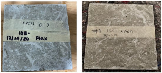 The preparation of the cementitious portion of the honeycomb sandwich panels closely follows ASTM305-14 “Standard Practice for Mechanical Mixing of Hydraulic Cement Pastes and Mortars of Plastic Consistency”, with minor adjustments for the addition of flax fibres [21]. Firstly, we cut flax fibres to 10 mm in length to improve their dispersion in the cement paste, and then we added them 1% by weight to the mixing water, allowing the fibres to disperse before adding the liquid to the cement powder [20]. Because the moisture absorption behaviour of the composites is influenced by the fibre content [22], 1% by weight of flax fibres was considered in order to achieve the reinforcement, while preserving thermal characteristics. Then, using a 0.45 water–cement (w/c) ratio, Portland Cement powder was added without mixing for 30 s to allow for the absorption as described by ASTM [21]. Next, the cement paste was mixed at a low speed for 30 s, followed by a stoppage to scrape the bowl/mixer and finishing with additional mixing for 60 s at medium speed.