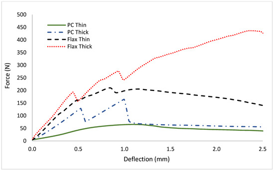 Figure 6 shows the results obtained from the flexural analysis. A force-displacement graph is displayed to assess the behavior of each sample type, namely PCthin, PCthick, Flaxthin, and Flaxthick, under three-point bending.