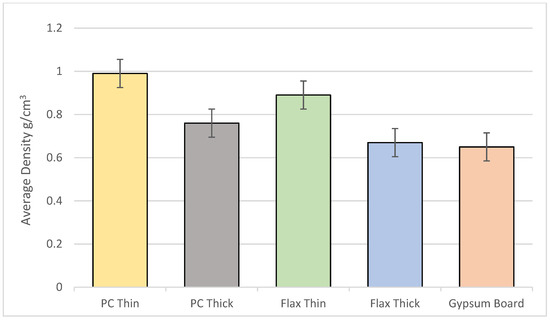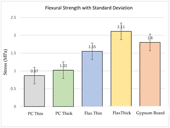 Table 3 and Figure 7 show the average ultimate strength of each sample type and the standard deviation bars. Based on the findings, had the lowest average maximum strength, i.e., 0.87 MPa. However, the average ultimate strength was slightly higher, at 1.02 MPa. Contrarily, both exhibited consistent, reliable results with lower standard deviations. The change in honeycomb thickness from 10.16 to 19.05 mm for the flax samples resulted in a considerable increase in the average ultimate strength, from 1.55 to 2.11 MPa. It was verified that the principal factors in determining the sample’s stiffness are the material’s modulus of elasticity and the structure’s geometry in terms of the planar moment of inertia. Therefore, thick samples in which layers are located further from the axis of motion resulted in higher stiffness. Thus, the sandwich panel could be more resistant due to the higher stiffness. In addition, as the maximal strength is dependent on the combination of sandwich thickness and the core thickness, the thicker core withstood more loads than the thinner one. Overall, it was determined that the samples with flax fibres exhibited less variability in results, and their flexural strength is superior to the PC panels. By using the average values, we determined that performed 44% better than the , and performed 52% better than the . In addition, as flax specimens showed higher strength compared to the gypsum board (12.7 mm thickness), with a strength of 1.8 MPa [34], this study was mainly focused on analyzing the thermal performance, density, and water vapour transmission of flax fibre samples.
