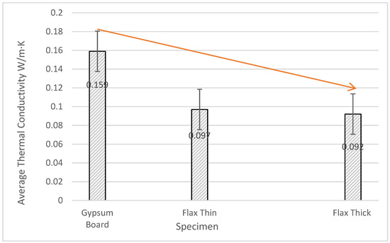This section presents and discusses the thermal performance of two different thicknesses of honeycomb sandwich panels with the addition of flax fibres. Figure 8 shows the average thermal conductivities of the sandwich panels and the gypsum board. Overall, there is a significant difference between the thermal conductivity curves of the gypsum board and sandwich samples. The findings indicated that the thermal conductivity of kraft-paper honeycomb sandwich panels was lower than that of the gypsum board. The incorporation of kraft-paper honeycomb in the cementitious panels has an interrelated effect on decreasing the thermal conductivity of samples because of the lower thermal conductivity of kraft-paper honeycomb compared to gypsum board. The results showed that the average thermal conductivities of gypsum board, were 0.159, 0.097, and 0.092 W/m·K, respectively. It was confirmed that the thick sample showed a larger decrease in the thermal conductivity compared to the thinner specimen. The likely reason is that, by increasing the core thickness, the amount of air volume in the volume of the honeycomb increases. Therefore, a decrease in the sample’s thermal conductivity happened due to the low thermal conductivity of air compared to the thermal conductivity of the kraft-paper honeycomb sandwich panel. The thermal conductivity of the gypsum board ranges from 0.154 to 0.164 W/m·K, with an average of 0.159 W/m·K. However, the thermal conductivity of was reduced by 39% and 42%, respectively, compared to the gypsum board.