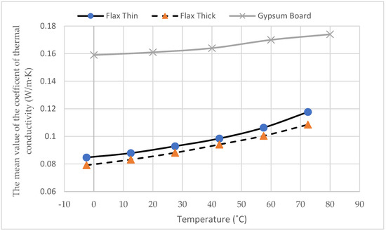 - Due to flax fibres’ lower thermal conductivity and better thermal insulation properties, all flax-fibre-reinforced panels exhibited lower thermal conductivity than the gypsum-based drywall. However, the thermal conductivity of showed a greater reduction, e.g., by 42%, compared to the gypsum board. The thermal analysis results confirmed that the samples’ air volume increased by raising the thickness of the sample. Therefore, effectively decreased the coefficient of thermal conductivity compared to in different temperatures and is more resistant against a heat flow due to its higher embodied porosity. The results indicated that the thermal conductivity of as a function of temperature, ranging from −10 to 80 °C, is relatively 5.4% higher than the thermal conductivity of