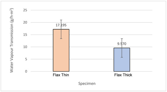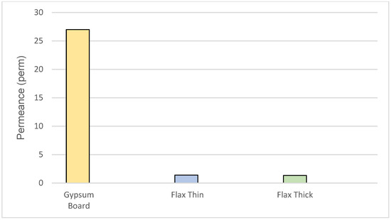 Water vapour transmission indicates the degree to which water vapour is transferred through a substance under specific temperature conditions and from regions of high relative humidity to regions of low relative humidity. The findings indicated a linear relationship between the total weight loss of dish assembly of water as a function of time. According to the ASTM standard, the slope of the line corresponds to the term of water vapour transmission rate. Figure 11 illustrates the average values of water vapour transmission of the flax-reinforced samples after reaching a steady state at the time of 23 h, where the rate of weight change is substantially constant. The results showed that had a lower average water vapor transmission, with the amount of 9.570 g/h·m2, compared to , with the amount of 17.195 g/h·m2. It was confirmed that water vapour transfer through building components is mainly dependent on two mechanisms: air leakage and diffusion [37]. However, as a kraft-paper honeycomb is a closed-cell structure, air leakage can be considered less of a significant problem than diffusion. In addition, as water vapour transmission is affected by the thickness of the materials, exhibited a higher decrease in the rate of water vapour diffusion. Figure 12 compares the average water permeance of two kraft-paper honeycomb sandwich panels and the gypsum board. Water vapour permeance is defined as “the timed rate of water vapour transmission through unit area of flat material or construction induced by a unit vapour pressure difference between two specified surfaces, under specified temperature and humidity conditions” [32]. A hygroscopic material has a great ability to absorb and/or desorb water from the surrounding environment until it reaches an equilibrium condition [38]. Gypsum board is a hygroscopic material, and as such, the results indicated that the gypsum board’s permeance is much higher compared to the developed sandwich panels. As permeance is inversely proportional to the thickness and directly related to water vapour transmission rate, , with a rise of core thickness, resulted in lower permeance rather than . The average permeance of and was 1.398 perms and 1.338 perms, respectively. Therefore, can be considered an adequate water-resistant material.