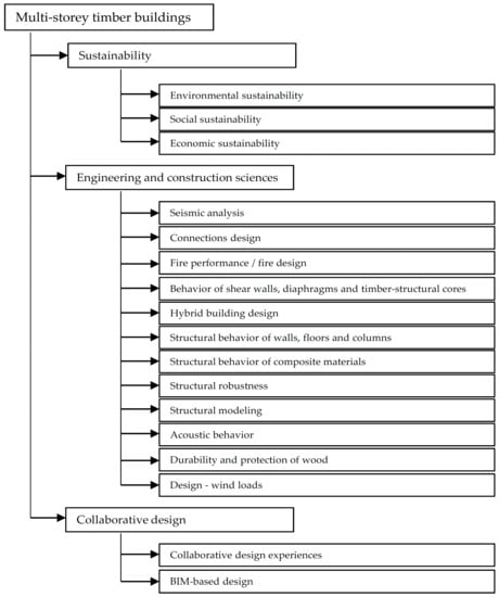 Qualitative research was carried out, based on comparative analyses of the content of the main conclusions of the articles found as a result of the literature review on multi-storey timber buildings. Preliminarily, three general theoretical data fields were proposed (Sustainability, Engineering and Construction Sciences, and Collaborative Design), according to what was stated in Section 1.1, Section 1.2, and Section 1.3. However, as the documentary review progressed, new data fields appeared on more specific topics associated with each topic. Due to the fact of this, the data fields were integrated into categories based on their common properties, generating the categorization shown in Figure 2.