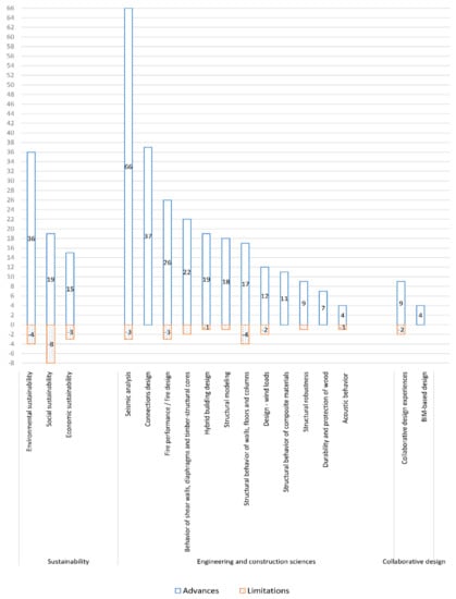 The contents considered as advances were much higher in number (331) than the conclusions found as limitations (35). In the sustainability category, the one that presents the highest frequency of positive content was environmental sustainability, while social sustainability was the one that exposes the most limitations related to the design of multi-storey timber buildings. For the engineering and construction sciences category, the publications associated with seismic analysis were the ones that presented the greatest number of advances, while the structural behavior of walls, floors, and columns category showed the greatest number of limitations. Finally, in the collaborative design category, the largest number of advances and limitations were found in the same subcategory, in this case, related to the documentation of collaborative design experiences.