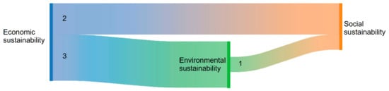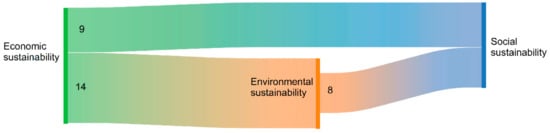 Figure 4 shows the Sankey diagram which relates the three subcategories in the nodes of the diagram, where environmental sustainability is shown in orange, social sustainability in blue, and economic sustainability in green. The width of the borders shown in the diagram corresponds to the frequency of co-occurrence between these subcategories.