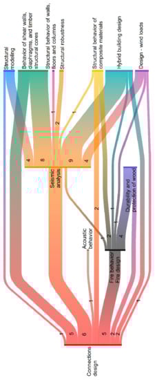 Finally, Section 3.3.1, Section 3.3.2, and Section 3.3.3 discuss the relationships from the three subcategories with the highest frequency of conclusions, that is, seismic analysis, connections design, and fire performance/fire design, and how these relate to the rest of the subcategories of engineering and construction sciences.