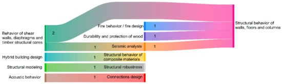 As in the previous analyses, Table 4 shows the analysis of co-occurrences with the frequency of conclusions considered advances. In the seismic analysis subcategory, 31 advances were evidenced; In the connections design subcategory, 26 positive conclusions were found, while 19 advances were obtained under the fire performance/fire design subcategory. For the subcategories, behavior of shear walls, diaphragms, and timber structural cores, and structural modeling, 16 advances were found in each case. For the subcategory, design against wind loads, 13 advances were evidenced. For the subcategory hybrid building design, 12 advances were evidenced. For the subcategories structural behavior of walls, floors, and columns, and durability and protection of wood, 11 advances were found in each case. For the subcategory structural robustness, nine advances were evidenced. For the subcategory structural behavior of composite materials, seven advances were evidenced. Finally, in acoustic behavior, three findings characterized as advances were evidenced.