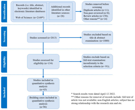 As illustrated in Figure 1, the initial search gave rise to 2169 articles from WoS and 28 studies from other search sources, e.g., the reference lists of the read articles. After removing duplicate articles, review articles, non-English articles, etc., the initial screen resulted in 2013 studies. Then, the title and abstract screening and the full-text screening led to 43 valid studies (96 building cases in total) for the subsequent meta-analysis.
