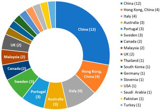 Figure 4 shows the geographical distribution (countries/regions) of the reviewed studies. It is interesting to observe that almost 40% (16 of 34) of the studies targeted the carbon performance of prefabricated buildings in China (including four studies in Hong Kong, China). China was followed by Italy, where four relevant studies were performed. Australia, Portugal, and Sweden each published three relevant studies. It is not surprising that China leads the research in this field. In the past several years, the volume of new construction in China has been ranked highest in the world, and the Chinese government has strongly promoted carbon reduction through prefabrication and off-site construction [1].