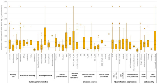 When identifying the influencing factors of carbon quantification, opinions were drawn from some previous reviews listed in Table 1. However, as mentioned in the introduction section, the factors directly related to the quantification process have not been identified before. Therefore, this research further investigated the relevant literature [15,16,17,18] and proposed the factors related to the carbon quantification process, i.e., emission sources coverage, types of GHGs considered, quantification tools/software, carbon inventory databases, data sources, etc. In total, twelve factors that affect the quantification of the embodied carbon of prefabricated buildings have been identified, as shown in Table 2. This review classified the twelve factors into four categories based on their nature and the findings of previous studies (i.e., [11,15,17]), namely building characteristics, emission sources, quantification approaches, and data quality, as listed in Table 2. The standard deviation (SD) of the carbon emission values of the 96 cases was calculated to demonstrate their degrees of dispersion. Then, the carbon emission values of the 96 cases are analyzed against the twelve influencing factors through box plots; these meta-analysis results are further explained in Section 3.2.