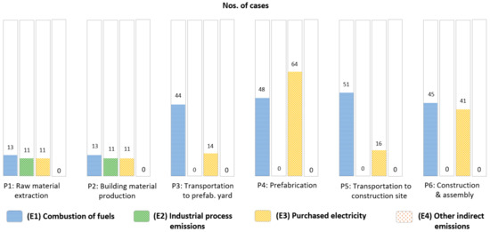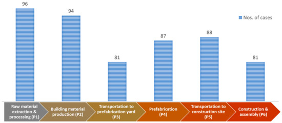 As shown in Figure 7, all 96 reviewed cases have been analyzed regarding the carbon emission associated with the raw materials’ extraction and processing (P1). The least studied life cycle phases, namely the transportation of building materials (P3) and prefabricated components/units (P5), were studied in 81 cases. However, as observed in Table 2, only 69 (72%) cases fully covered the cradle-to-site (P1–P6) embodied carbon emission, while 13 cases considered the cradle-to-site entrance gate (P1–P5), six cases considered the material production phases (P1–P2), and eight cases applied other emission boundaries.