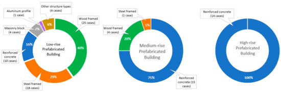 The level of prefabrication or prefabrication rate of building in this review was defined as very low (<10%), low (10–25%), medium (25–60%), and high (60–100%). As indicated in Figure 6, out of the 96 building cases, only 48 cases provided relevant information on the prefabrication rate. Specifically, two (2%) building cases had a very low level of prefabrication, seven (7%) had a low level of prefabrication, 11 (11%) had a medium level of prefabrication, and 28 (29%) had a high prefabrication rate. It can be observed from Figure 5 that the embodied carbon of a building does not decrease with an increase in the prefabrication rate. Rather, the minimum embodied carbon was obtained when the prefabrication rate reached an optimal value. This finding is in line with the study conducted by Du et al. (2019) [19].