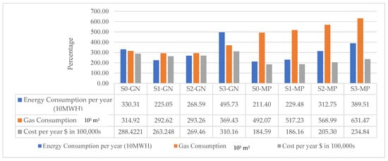 Three simulations were performed for MP and GN, respectively. Each simulation covered different envelope materials (mud, stone, and concrete). Each building had different energy conditions and, consequently, resulted in different scores for the energy factor. These simulations would provide contexts for the envelope material. Simulated data were compared to the actual energy-consumption data, and the results are shown in Figure 6 and Table 3a,b. For instance, the actual energy consumption of GN is 3,303,099 kWh, while simulation results showed a yearly energy consumption of 2,250,501 kWh. Furthermore, concrete buildings consumed the highest amount of energy for both GN and MP. The mud building, in the case of GN, and the stone building, in the case of MP, showed the lowest energy consumption. Similarly, the highest gas consumption, in the case of MP, was that of the concrete building, while the lowest was that of the stone building. Values of energy and gas consumption are reflected directly in the yearly cost. For instance, the stone material, in the case of MP, had the highest energy and gas consumption across the different material envelopes, and, as a result, the stone material yielded the highest cost.