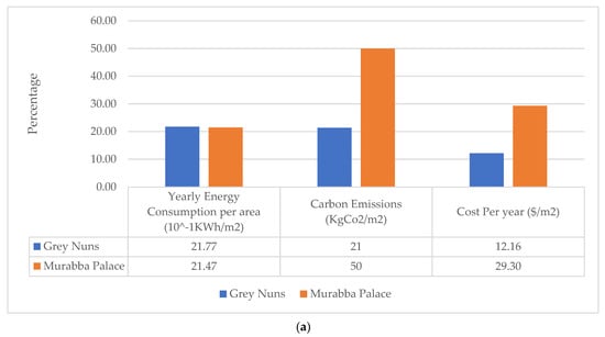 Energy and carbon consumption. (a) Energy, carbon consumption, and cost per m2. (b) Energy consumption for Murabba Palace and Grey Nuns Building.