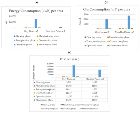 After ensuring the reliability and consistency of the data obtained from questionnaires, questionnaire responses were analyzed and presented in Figure 7a,b to illustrate electricity consumption, gas consumption, and cost, respectively, for both case studies. In Figure 7c, we can see that the operation phase had the highest energy and gas consumption for both buildings, with energy consumption of almost 150,000 kWh per area and 20,000 kWh per area for GN and MP, respectively. Similarly, for all the six project life-cycle phases, the cost of the operation phase was also the highest, with values of 222,085 CAD/m2 and 142,134 CAD/m2 for GN and MP, respectively. The planning phase, however, had the lowest energy and gas consumption and cost in both GN and MP, with costs of 5768 CAD/m2 and 3692 CAD/m2, respectively. Energy-savings generated from using mud envelope material rather than the current stone envelope material was calculated as 1,052,598 kWh per year for GN.