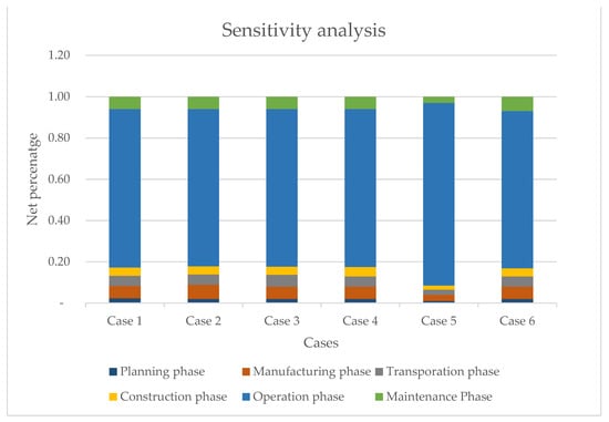 The six cases are described as follows: Case 1—the weight of the planning phase was increased by +15%; Case 2—the weight of the manufacturing phase was increased by +15%; Case 3—the weight of the transportation phase was increased by +15%; Case 4—the weight of the construction phase was increased by +15%; Case 5—the weight of the operation phase was increased by +15%; and Case 6—the weight of the maintenance phase was increased by +15%.
