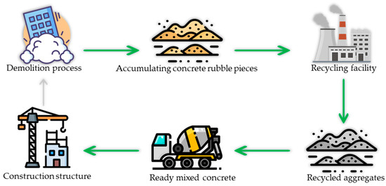 - JACOB, L.L.G. Effects of Recycled Aggregates on Concrete Properties. Master’s Thesis, National University of Singapore, Singapore, 2011. [Google Scholar]