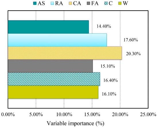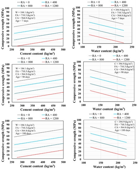 | Variables | W (kg/m3) | C (kg/m3) | FA (kg/m3) | CA (kg/m3) | RA (kg/m3) | AS (days) | CS (MPa) |