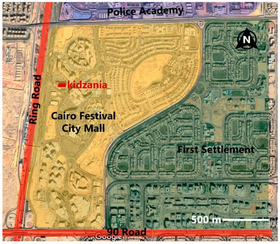 This study was conducted in Kidzania, Cairo, which is the first edutainment environment for children in Egypt [59]. This branch of the global Kidzania brand opened in 2013 [44,45], as a stand-alone facility across an area of over 8000 m² [60]. It is located in Cairo Festival City Mall (CFCM), which is confined from the north by an important security landmark, the Police Academy, and it is surrounded by the first settlement housing plots from the east. CFCM is bounded with two main roads: the Ring Road on the western side and 90 Road on the southern side (Figure 1).