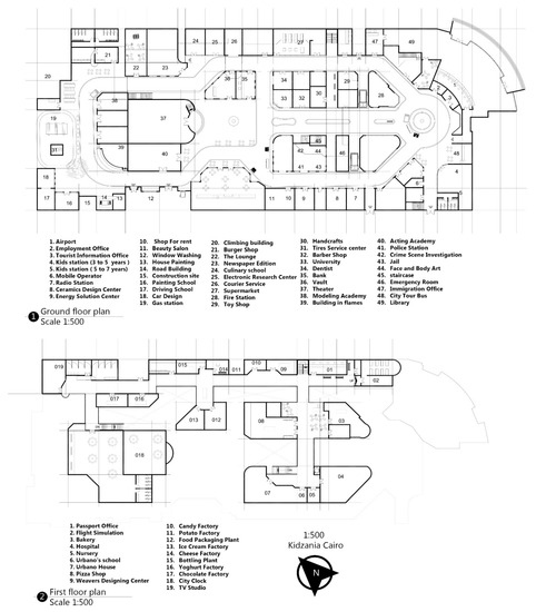 Kidzania is a two-story building with multiple stations. The architectural plans of the edutainment environment are shown in Figure 2.