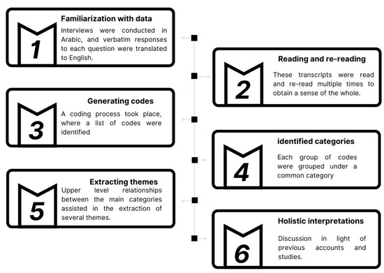The data were first prepared and organized, then coding and categorization was conducted [67]. All the audio recordings of the semi-structured interviews were translated and then transcribed. These transcripts were read and played multiple times to obtain a sense of the whole and accordingly capture the common repetitive ideas and themes. A coding process took place, where a list of codes was identified.