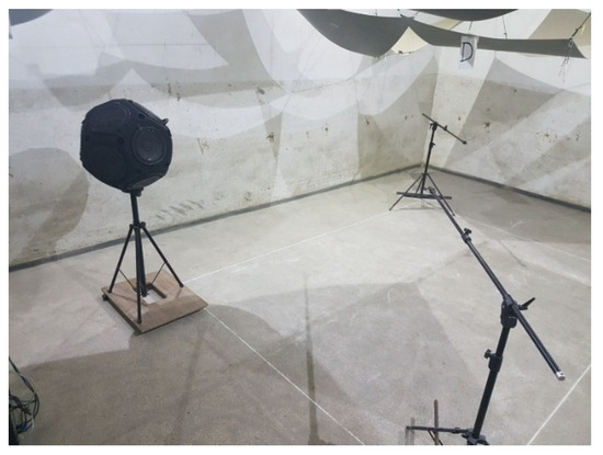 The positions of the microphones during the measurements were at least 1.5 m from each other and at least 2.0 m from the sound source. The location of the sound source and microphones during the measurement is shown in Figure 2.