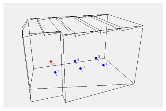 Model of the reverberation room with the measuring points (1–5) and sound source (P1).