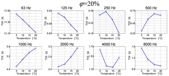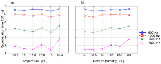 Figure 4 presents the measurement results of the reverberation time as a function of the temperature or relative humidity for selected frequency bands.