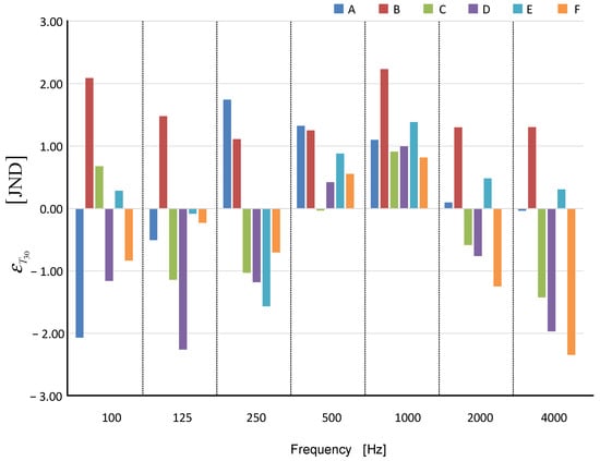 Normalized JND error as a frequency function for six cases: A—, B—, C—, D—, E—, and F—.
