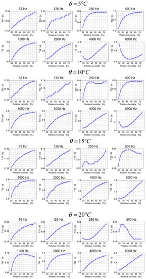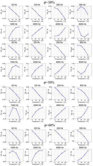 The results presented in Figure 7 can be viewed as quite interesting. It turns out that the reverberation time in a room as a function of temperature in this room may have different characteristics depending on the frequency band. For low frequencies, the reverberation time as a function of temperature generally decreases, and for high frequencies, it generally increases. At the same time, the frequency in the 1000 Hz band increases for low temperatures, and after exceeding the limit of 15 °C, it decreases. Therefore, the subsequent graphs in Figure 8 show the reverberation time courses as a function of relative humidity at different air temperature values.