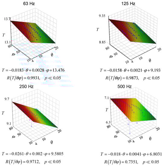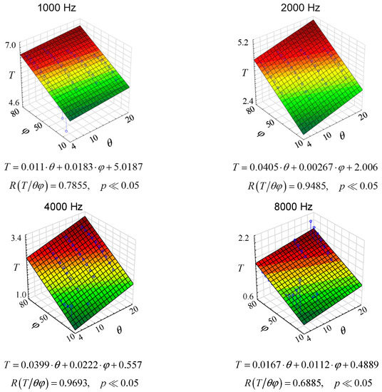 As it can be seen from the graphs in Figure 9, multiple correlations are different for each case. In fact, it is quite logical because, as shown, e.g., in Figure 7 or 8, the changes are non-linear. Yet, Figure 9 contributes something to the general knowledge. Firstly, the linear coefficients are quite high, which leads to the conclusion that there is a linear correlation between the reverberation time in a room and the thermo-hygrometric condition. Secondly, the changes in reverberation time under different thermo-hygrometric conditions are significant, which suggests that thermo-hygrometric conditions should be taken into account when estimating reverberation time. This conclusion is important primarily for rooms with long reverberation.