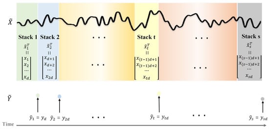 Each stack is then regarded as a timestamp, and the total number of timestamps is s. It is worth noting that each new timestamp input comprises the data of time nodes in the original sequence X. The input sequence and output sequence at the t-th timestamp can be expressed by Equations (5) and (6):