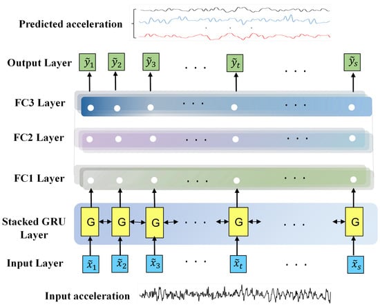 The acceleration of the structure’s current time node is affected by the acceleration of the previous period and is affected by environmental factors such as temperature and humidity []. To improve the reconstruction performance and robustness of the model in different environments, this paper proposes a stacked sequence-to-sequence GRU NN with FC layers.