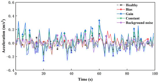 Owing to the limitations of environmental influences, external load influences, and performance degradation of the sensor itself, sensors placed in civil engineering structures fail over time. Because the sensor failure model summarized in multiple studies is relatively mature, it is similar to the failure of the sensor installed in the actual structure [,,]. In this section, four common sensor failure models are constructed to better simulate sensor failures. They have proved to be similar to actual sensor fault signals and were widely used in sensor fault research [,,,].