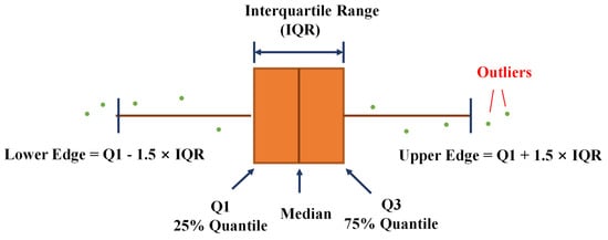 As a statistical method that describes the discrete distribution of data that is relatively stable and less affected by outliers, the box-plot plays a major role in the field of data mining and outlier detection [,]. The box-plot usually consists of five value points: the lower edge, 25% quantile (Q1), median, 75% quantile (Q3), and upper edge. The distance between Q1 and Q3 is called the interquartile range (IQR). The structure of the box-plot is shown in Figure 5.