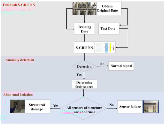 During anomaly detection, sufficient data on the structure in its normal operation state are first obtained, and various learning parameters in the network are initialized. The acquired data are then sent to the S-GRU NN model for data fusion and training. The measurement signal of the sensor is reconstructed via iterative update learning. The residuals of the reconstructed and measured values can be obtained as