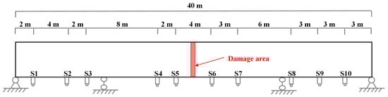 Referring to the literature [,], we used a three-span continuous beam model as shown in Figure 7 to generate training and validation data and to evaluate the correctness of the S-GRU NN for signal reconstruction. The beam element in ABAQUS was used for the structural analysis. The length of the model structure was 40 m, and its cross-sectional area was 0.25 × 0.6 m. The model is divided into 200 equal cells, each with a length of 0.2 m. The mass density of the material is 2400 kg/m3, elastic modulus E is 30 GPa, Poisson’s ratio is 0.3, and damping type was set to Rayleigh damping. Referring to the method in the literature [], Gaussian white noise with a maximum amplitude of 0.4 m/s2 was used as excitation and applied to each support at the same time. The dynamic reaction of the structure was captured by ten acceleration sensors (S1–S10) positioned on the beam. The sampling frequency was 100 Hz and 300 data samples with a duration of 10 s were obtained. In general, a response time series of 10 s is adequate for a network to learn the characteristics of the data []. As the time series increases, the model’s generalization ability becomes more powerful, but increases the requirements and computation of the CPU. Referring to the method in the literature [], the elastic moduli of the ten beam elements in the middle of the central span were reduced by 5, 15, and 25%, respectively, to simulate three different degrees of damage, as shown in Figure 7.