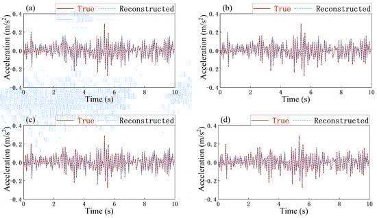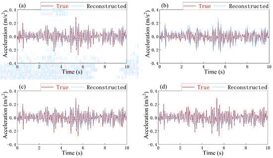 An example of the reconstructed responses obtained by the different methods is shown in Figure 16. The relative error of S-GRU NN reconstruction signal is 11.2%, while the relative errors of GRU, LSTM, and CNN reconstruction signals are 15.8, 18.5 and 19.0%, respectively. It can be found from Figure 16c,d that the reconstructed signals from the three compared models have a larger error in the maximum magnitude, which has a great response to the damage detection of the structure. However, as shown in Figure 16a, the unique network structure allows the S-GRU NN to learn more detailed features from the response signal, and the reconstructed signal is closer to the true response.